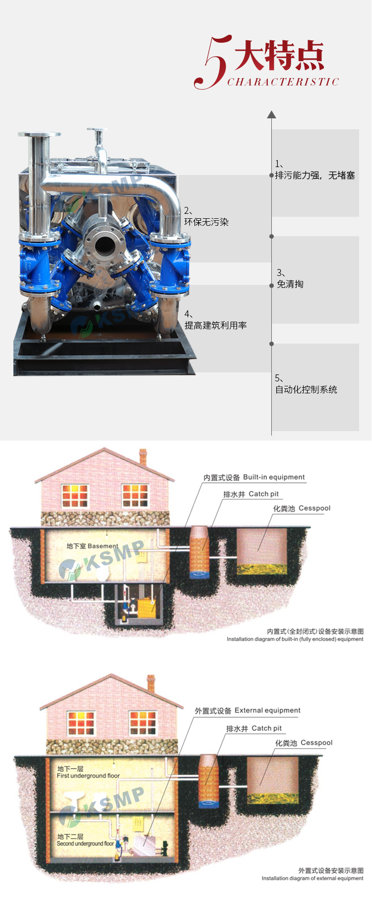 传统的建筑物地下室生活污水排放,当污水管道不能以自重力自流排入污水管道时,设置集水池和污水泵提升至室外检查井,然而这种污水排放形式在实际应用当中存在诸多弊端,如污物极易造成沉积和堵塞,须定时人工除污清洗;污水泵经常被杂物卡死至损坏;清掏过程中所散发的臭味污染周围环境等,所以时间证明这种污水排放形式并不理想。