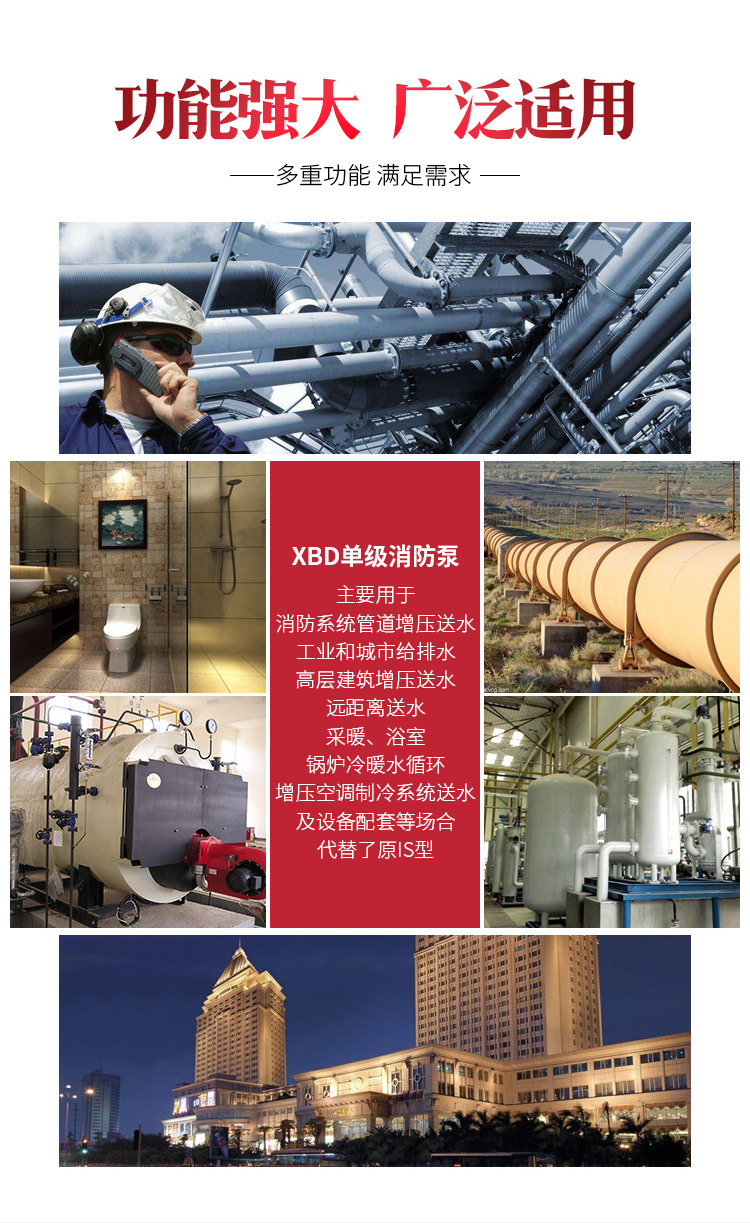 XBD系列单级消防泵组,供输送不含固体颗粒的清水及物理化学性质类似于水的液体之用,主要用于消防系统管道增压送水,也可适用于工业和城市给排水,高层建筑增压送水、远距离送水、采暖、浴室、锅炉冷暖水循环、增压空调制冷系统送水及设备配套等场合。