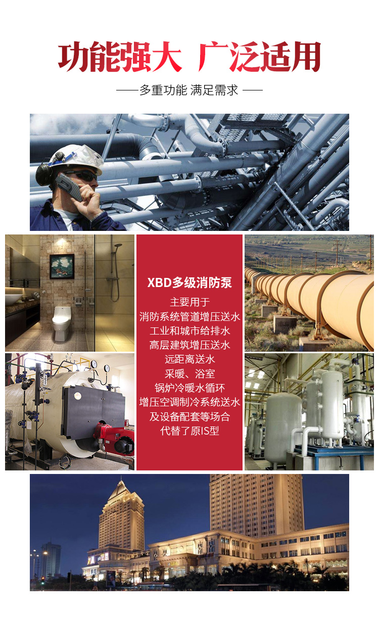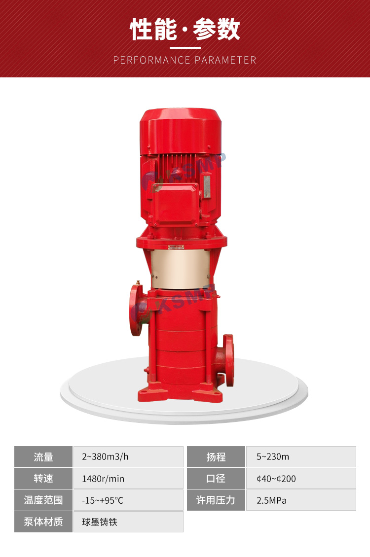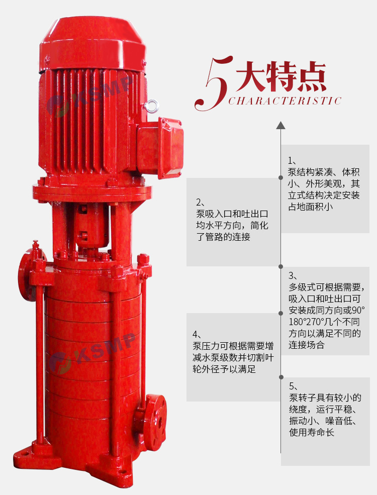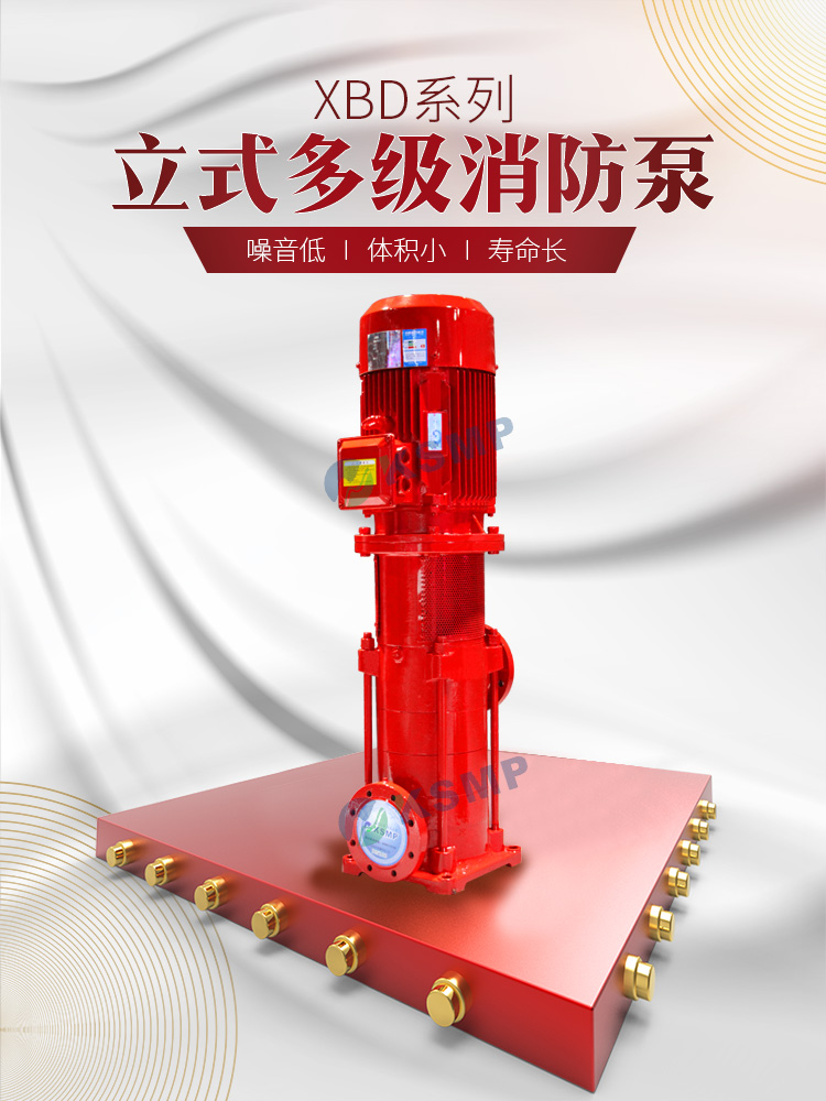 本公司在原有立式多级泵基础上根据对消防泵的要求进行开发出的新一代XBD型中低压消防泵组产品。该系列泵在性能、结构、材料和配套上均满足消防泵的要求。由于采用水力模型,因此该系列泵具有满足用户要求;采用立式泵结构,具有效率高、性能范围广的特点,可更好地节省占地面积的优点;采用优质轴承和优质电机,使泵运行更为安全可靠、噪音低、振动小;采用水力平衡轴向力,减少平衡鼓,可使运行更为平稳。其轴封有机械密封和填料密封两种形式。