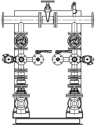 的设计参数要求大,我们同时开发了三台消防泵(两用一备)集中布置的供水机组,通过两台消防泵并联同时运行达到大的设计参数要求。