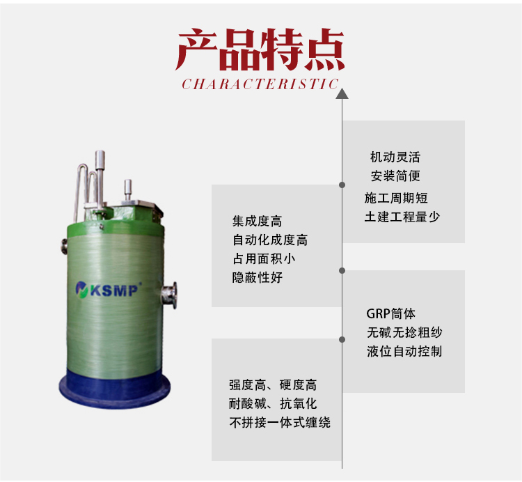 一体化预制泵站主要使用在市政工业地下室排水、地铁排水、生活排污、工厂等低于地面的一种地区污水处理设备。具有占用面积小、安装隐蔽。不影响周围环境等优点。由于一体化预制泵站采用GRP玻璃钢材质,抗腐蚀及抗渗透能力强,增加了使用寿命,安全稳定。